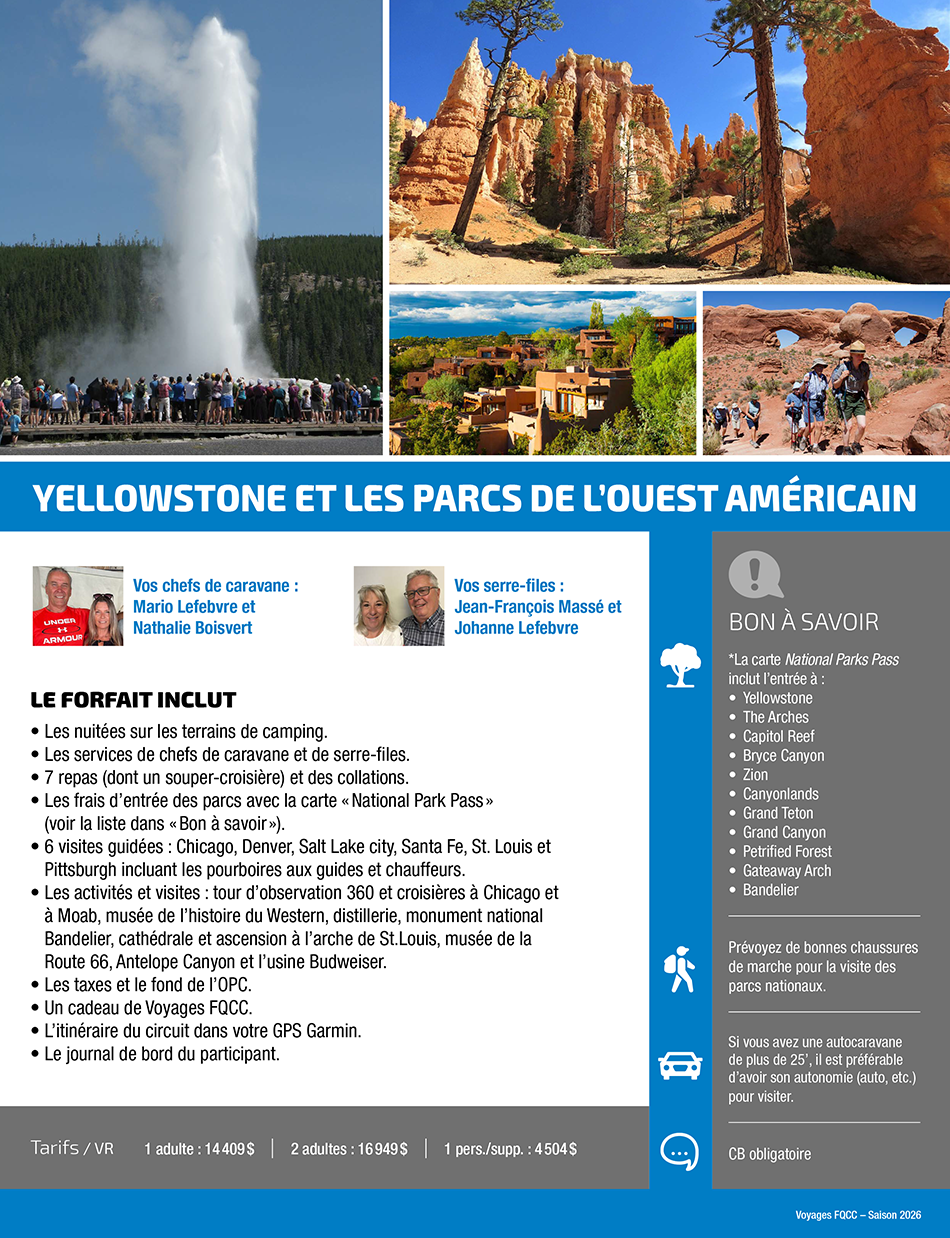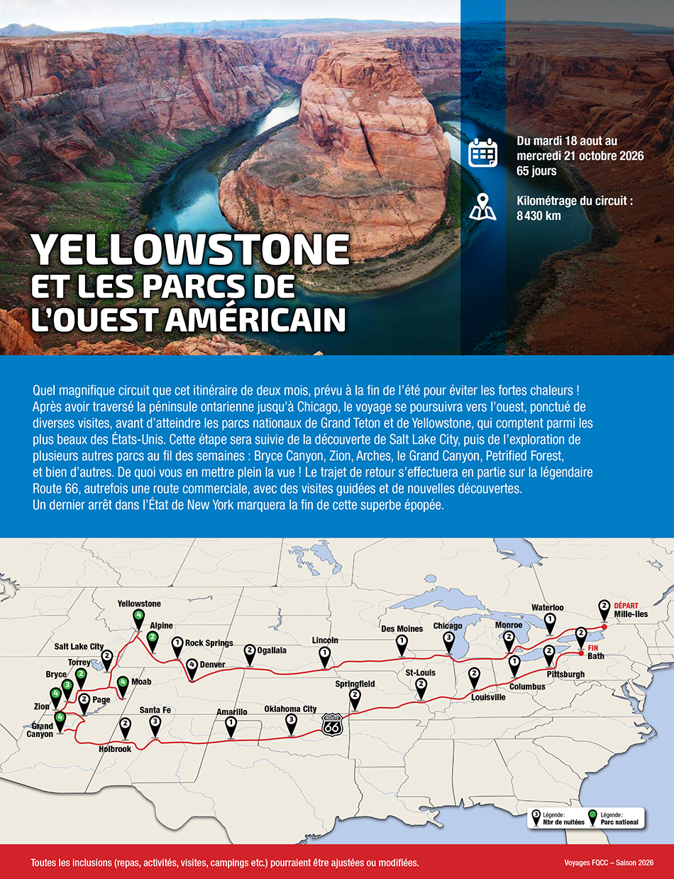 Quel magnifique circuit que cet itinéraire de deux mois, prévu à la fin de l’été pour éviter les fortes chaleurs! Après avoir traversé la péninsule ontarienne jusqu’à Chicago, le voyage se poursuivra vers l’ouest, ponctué de diverses visites, avant d’atteindre les parcs nationaux de Grand Teton et de Yellowstone, qui comptent parmi les plus beaux des États-Unis. Cette étape sera suivie de la découverte de Salt Lake City, puis de l’exploration de plusieurs autres parcs au fil des semaines : Bryce Canyon, Zion, Arches, le Grand Canyon, Petrified Forest, et bien d’autres. De quoi vous en mettre plein la vue! Le trajet de retour s’effectuera en partie sur la légendaire Route 66, autrefois une route commerciale, avec des visites guidées et de nouvelles découvertes. Un dernier arrêt dans l’État de New York marquera la fin de cette superbe épopée.)