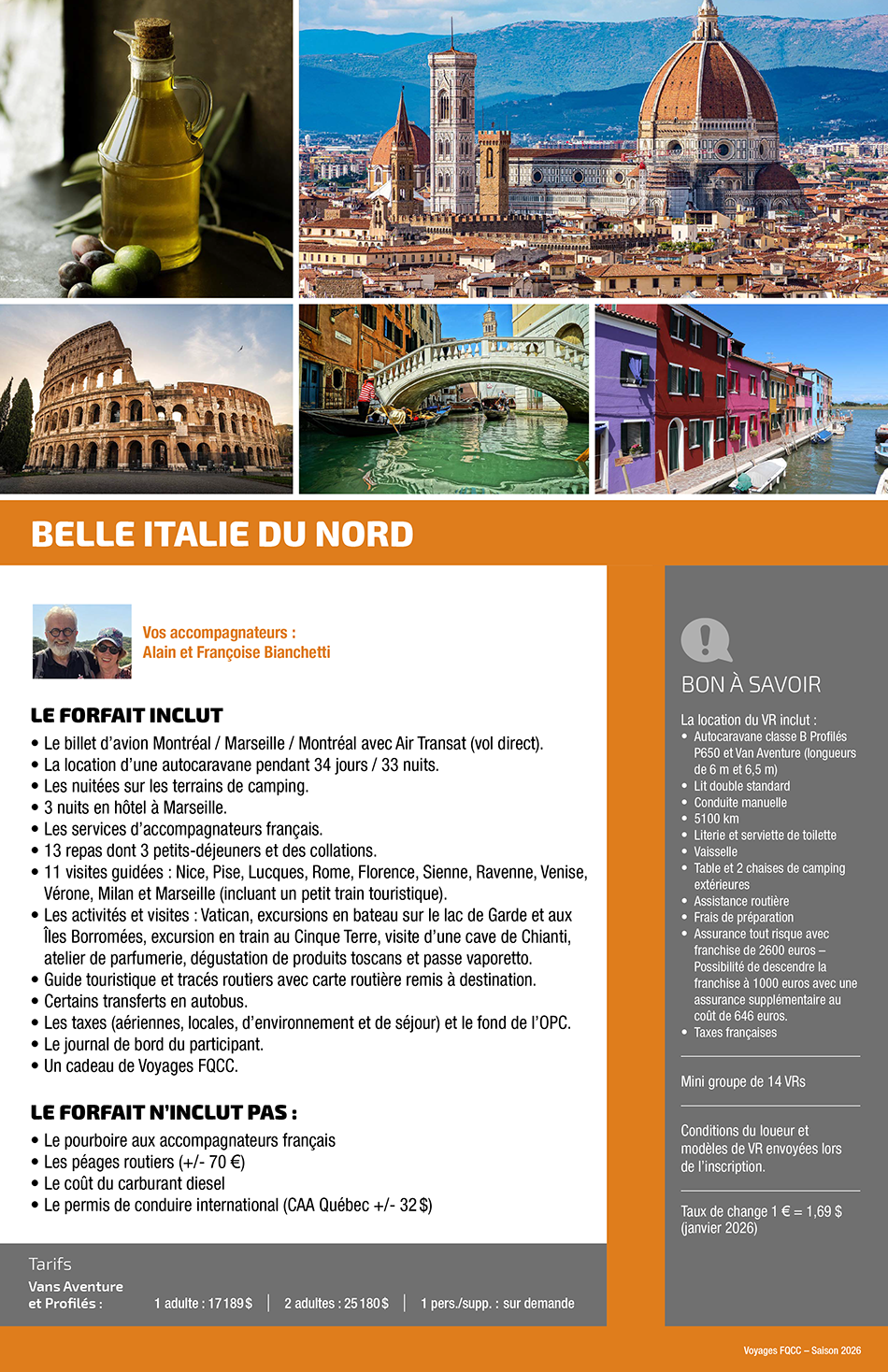 Quel beau voyage vous attend durant plus de 5 semaines! Magnifique boucle, qui partira de Marseille et de la Côte d’Azur, avant de rejoindre l’Italie du Nord et ses merveilles. La tour penchée de Pise et les villages colorés des Cinque Terre seront sur votre route avant une arrivée à Rome, pour 4 nuits. Deux visites guidées vous permettront de découvrir les incontournables: le Vatican, les monuments de la Rome antique, la célèbre fontaine de Trévi, le Colisée, le Panthéon et bien d’autres ! La route se poursuivra en Toscane, belle région de collines aux cyprès et oliviers où le vin est aussi doux que le climat. Visite de Florence, véritable berceau de la Renaissance, de San Gimignano, ville médiévale, de Sienne, de Ravenne puis de Venise et ses îles Burano et Murano. Vous en aurez plein les yeux de tant de merveilles.