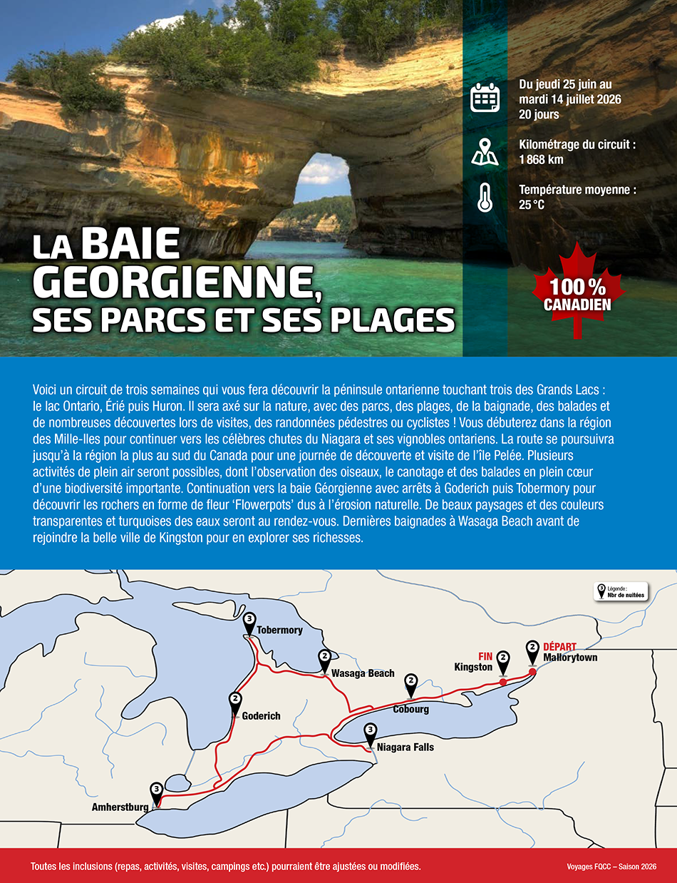 le lac Ontario, Érié puis Huron. Il sera axé sur la nature, avec des parcs, des plages, de la baignade, des balades et de nombreuses découvertes lors de visites, des randonnées pédestres ou cyclistes ! Vous débuterez dans la région des Mille-Iles pour continuer vers les célèbres chutes du Niagara et ses vignobles ontariens. La route se poursuivra jusqu’à la région la plus au sud du Canada pour une journée de découverte et visite de l’île Pelée.