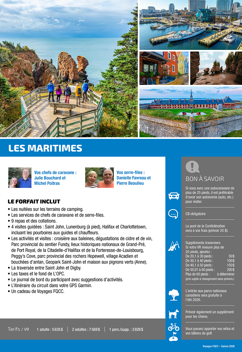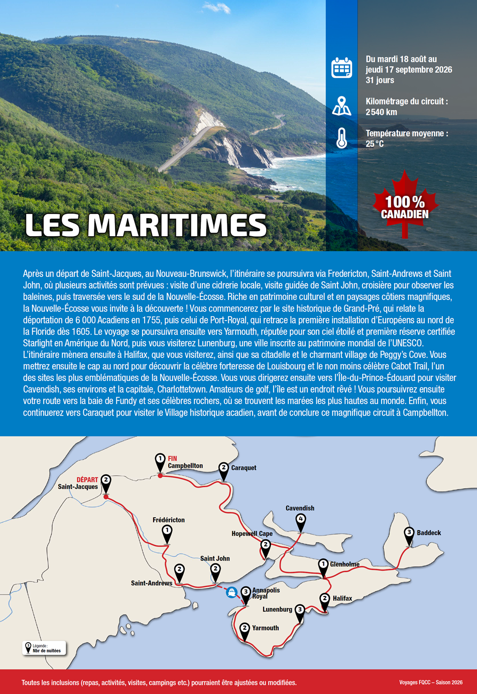 Après un départ de Saint-Jacques, au Nouveau-Brunswick, l’itinéraire se poursuivra via Fredericton, Saint-Andrews et Saint-John, où plusieurs activités sont prévues : visite d’une cidrerie locale, visite guidée de Saint-John, croisière pour observer les baleines, puis traversée vers le sud de la Nouvelle-Écosse. Riche en patrimoine culturel et en paysages côtiers magnifiques, la Nouvelle-Écosse vous invite à la découverte! Vous commencerez par le site historique de Grand-Pré, qui relate la déportation de 6 000 Acadiens en 1755, puis celui de Port-Royal, qui retrace la première installation d’Européens au nord de la Floride dès 1605. Le voyage se poursuivra ensuite vers Yarmouth, réputée pour son ciel étoilé et première réserve certifiée Starlight en Amérique du Nord, puis vous visiterez Lunenburg, une ville inscrite au patrimoine mondial de l’UNESCO. L’itinéraire mènera ensuite à Halifax, que vous visiterez, ainsi que sa citadelle et le charmant village de Peggy’s Cove. Vous mettrez ensuite le cap au nord pour découvrir la célèbre forteresse de Louisbourg et le non moins célèbre Cabot Trail, l’un des sites les plus emblématiques de la Nouvelle-Écosse.